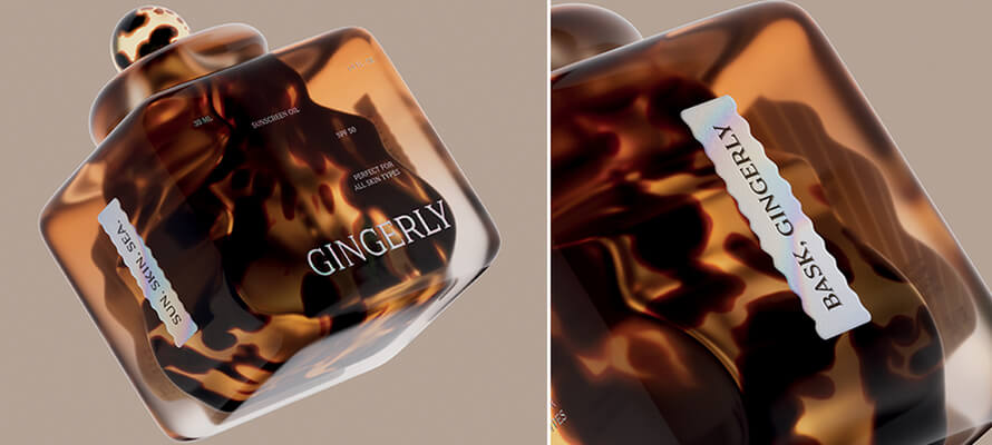 Designsake Studio (USA) si è concentrato sul continuo aumento della temperatura terrestre per creare Gingerly, un nuovo marchio di creme solari di lusso con la missione finale di un protezione solare priva di plastica. In collaborazione con Estal, il team creativo ha creato un componente unico in vetro a doppia parete ispirato ai colori, alle forme e alle texture del mare. Un motivo maculato, che ricorda lentiggini e conchiglie, inonda la parete interna della bottiglia. Al contrario, la parte esterna ha una sfumatura ambrata naturale, evocativa della linea dell’orizzonte dell’oceano. Le carta Avery Dennison, nobilitata con la lamina iridescente di Luxoro-KURZ ricorda la texture e i colori delle conchiglie di abalone, mentre dei raggi di sole in rilievo baciano l’etichetta posteriore. Ogni aspetto del concept ha lo scopo di premiumizzare la crema solare e dimostrare che un’esperienza senza plastica è possibile e auspicabile.