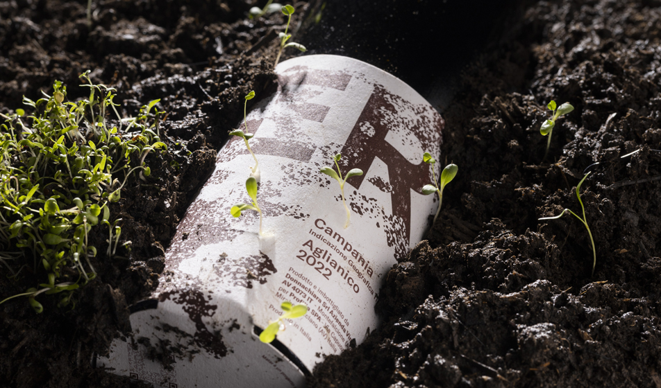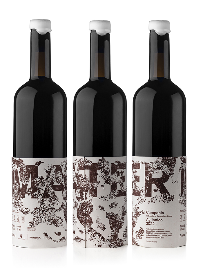 Nel progetto Mater questa scelta assume anche un forte valore simbolico: l’etichetta è stampata in letterpress con un inchiostro naturale sviluppato su misura a base di pigmenti di Aglianico, barbabietola e cardamomo, rafforzando il legame tra materia, territorio e racconto visivo. Piantami® non è quindi solo un supporto tecnico, ma il cuore concettuale del progetto: un materiale che rende tangibile l’idea di rinascita e fa del packaging un’esperienza destinata a continuare oltre l’ultima goccia di vino.