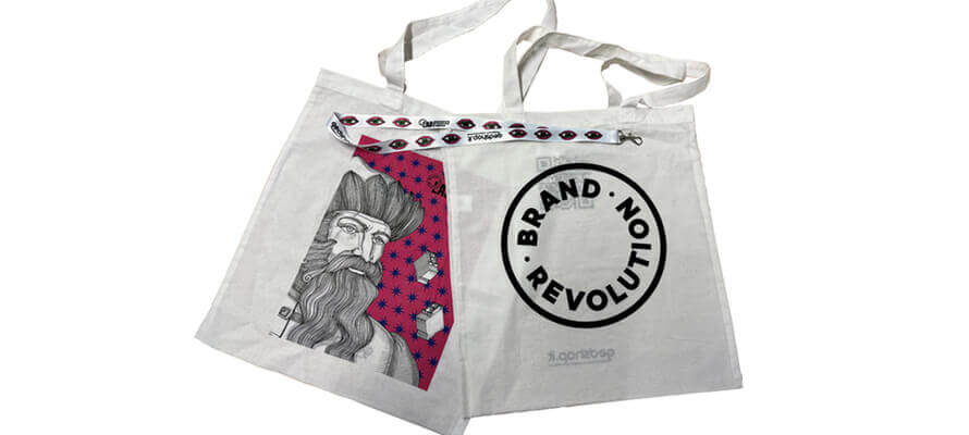 Grazie a Gedshop.it, il tema Metamorphosis è declinato anche sui cordini porta badge, stampati in quadricromia su supporto in poliestere, e sulle tote bag di cotone, stampate in serigrafia sul fronte a 4 colori e a 1 colore colore sul retro.