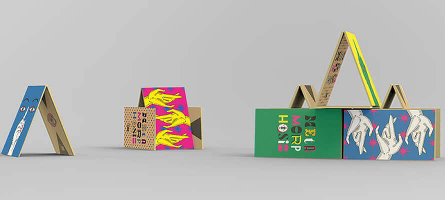 Ad accogliere il pubblico c’è un imponente portale, di 9 metri per 5, costruito con 376 scatole di cartone a onda, tutte di uguale misura (342x172x682 mm) e incastrate come mattoni. 106 scatole avana compongono il lato verso la reception, volutamente tenuto neutro per preparare il visitatore all’esplosione di colore che lo attende oltre l’ingresso. Il portale centrale accompagna le persone in una nuova dimensione in cui la parete si estende e si colora: l’altro lato infatti è composto da altrettante scatole bianche, stampate da ICO con tecnologia digitale e inchiostri ad acqua: ogni scatola è il tassello di un puzzle che compone l’immagine del concept. Altre 164 scatole sono utilizzate a supporto e posizionate in tre file studiate ad hoc con forma a tribuna per dare a tutta l’installazione profondità e tridimensionalità. Tecnicamente la parete è costituita da un’intelaiatura centrale, in legno di abete, sulla quale sono fissate sia da una parte sia dall’altra le scatole incollate fra loro.