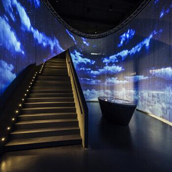 Anche gli ambienti, arredati per rispondere a una nuova vocazione del museo sono, come si può immaginare, palcoscenici delle infinite possibilità combinatorie della stampa digitale. Pareti, pavimentazioni, oggetti decorati. tavoli digitali, strutture interattive, schermi, percorsi segnaletici, installazioni… è tutto un caleidoscopio di materiali speciali, atmosfere suggestive, superfici sofisticate, location espositive grafiche e coinvolgenti.