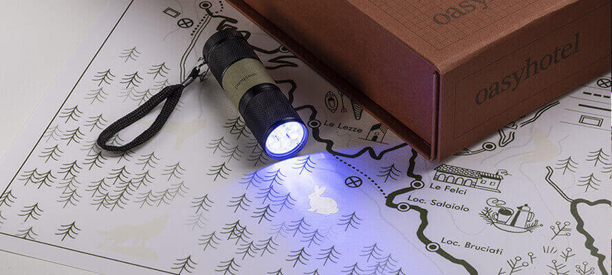 Completa il progetto una mappa stampata da Grafical in digitale HP Indigo 7900 con uno speciale inchiostro invisibile che, illuminato con la torcia contenuta nel kit, svela le aree in cui è possibile avvistare i lupi nell’oasi del lodge.