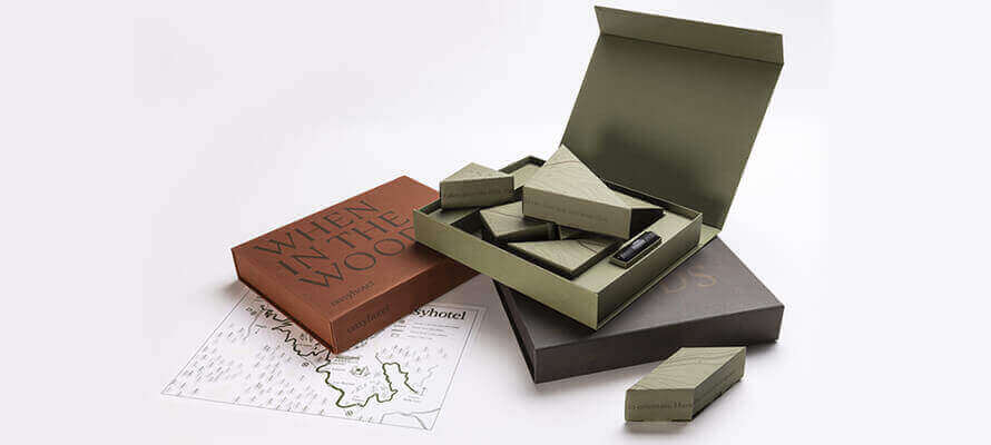 Oasyhotel è una struttura composta da luxury lodge immersi nella natura di un’area protetta del WWF in Toscana. Qui gli ospiti vivono esperienze alla scoperta della fauna che abita il luogo: trekking sulle tracce del lupo, falò notturni ascoltando le voci del bosco e molto altro. La Welcome box con cui i clienti vengono accolti nei loro lodge è stata studiata per “giocare” con gli animali anche all’interno dei Lodge o una volta tornati a casa: racchiude infatti 7 piccole box di forme diverse, ognuna contenente un oggetto da utilizzare (mascherina per la notte, poncho per la pioggia) o gustare (miele, biscotti e tisane prodotte nell’Oasy) durante il soggiorno. Le 7 sagome delle box sono quelle di un tangram e, spostandole su un piano, creano le figure di molti animali diversi. La Welcome Box contiene anche una mappa dell’oasi, stampata con un inchiostro particolare, che quando viene illuminata con la luce mostra le zone dell’oasi in cui è possibile avvistare lupi e volpi. «La carta Wild di Gruppo Cordenons ci ha ispirato nel realizzare un packaging che al tatto e alla vista fosse in sintonia con i colori della natura presente all’oasi. Per le finiture abbiamo utilizzato un bronzo metallizzato. Con la stampa abbiamo cercato di ricreare indoor le esperienze di ricerca e avvistamento degli animali che solitamente viene fatta outdoor», hanno detto Elena Carella ed Emanuele Basso, founder & creative director di The 6th.