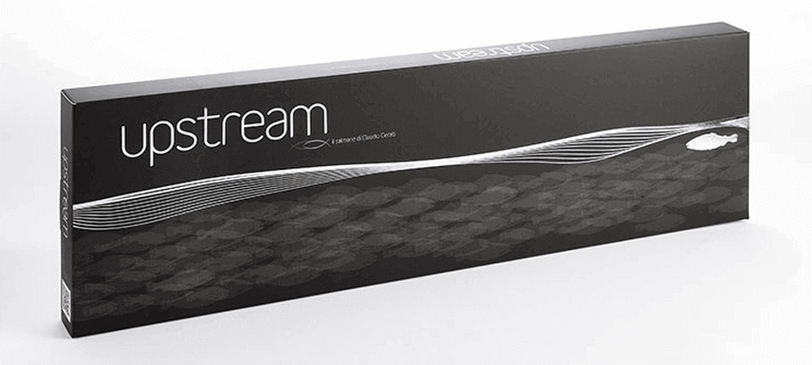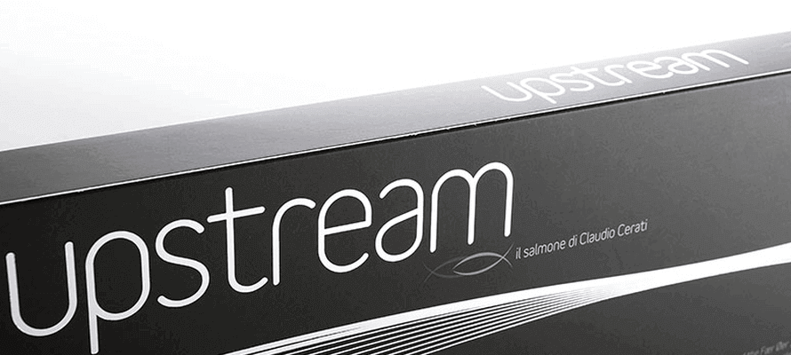 Un packaging che cerca di identificare a colpo d’occhio il prodotto com’è in realtà: “unico”, eccellente, esclusivo ma non vanamente pretenzioso. L’illustrazione è perciò pulita e minimale, richiamando a livello visivo “l’andar controcorrente” evocato dal nome (upstream = controcorrente = unico). La grafica è rarefatta, a dare risalto alla finitura in argento del salmone che risale la corrente (dei molti anonimi salmoni che saturano il mercato).
