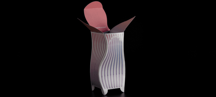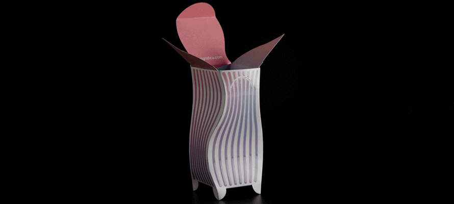 Troviamo così una busta classica che diviene incontro dei sensi, per catturare l’occhio e restituire un’intensa esperienza tattile; la multisensorialità è il fino conduttore che permea l’intero progetto, dallo scrigno esterno alla box nascosta al suo interno. Qui sfumature delicate e oniriche aprono la strada alla creatività il cui unico limite è l’immaginazione. Il progetto usa cartoncini patinati, in pura cellulosa, che si sono piegati alla volontà della cartotecnica nel realizzare un packaging stravagante ma pur sempre gentile. Ogni rifinitura contrastante tra le linee squadrate della busta e le curve morbide del portamatite viene messa in risalto attraverso l’utilizzo del 3D HiLux con il Cast&Cure, una delle nobilitazioni più in voga al momento grazie ai suoi effetti olografici. La bellezza dell’inaspettato rende l’apertura della pencil box ogni volta diversa agli occhi di chi la guarda. Come in uno scrigno prezioso, o un fiore che sboccia, l’inusuale è il segreto.