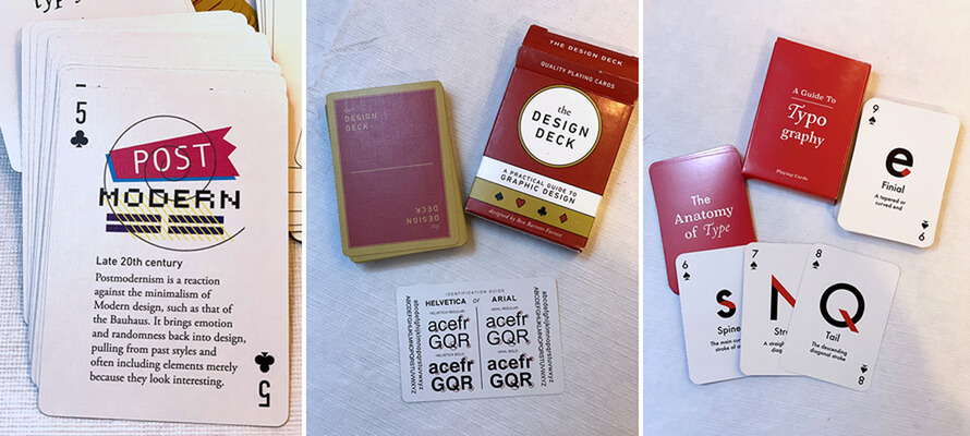 Some of the best decks are those that use the format for education. These can still promote a brand or product, but some are the product! The Design Deck(https://www.forrestgoods.com/shop/the-design-deck) created by Ben Barrett-Forrest is a brilliant multi-functional deck where every card is a playing card but also features design concepts on every card. Another is A Guide to Typographydesigned by Caisa Nilaseca for Design Taxi. Using the same concept of playing card with education, each card features typographic terminology. I keep both on my desk! They are great for those times when you are searching for an idea or concept but don’t have the right keywords to form a usable search prompt. They are well-produced and thoughtfully designed!