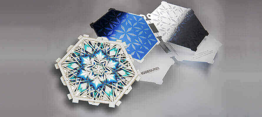 Nel campo del grande formato anche il digitale per la cordonatura e la fustellatura ha fatto passi da giganti: basta veder girare una macchina Highcon. Nel caso della cordonatura ad esempio, una volta acquisito il lavoro da un file, la macchina “scrive” su una lastra i cordoni con un polimero liquido che viene successivamente indurito con una lampada UV. Il foglio, passando tra il cilindro con i cordoni digitali e un contro-cilindro di pressione, viene rilevato esattamente secondo il tracciato impostato. Il taglio e il mezzo taglio sono ottenuti con il laser che consente anche la perforatura e la scrittura, perché per ablazione è possibile l’incisione del supporto, anche come sistema anti-contraffazione. Pur essendo sulla stessa linea, cordonatura e fustellatura sono passaggi distinti che possono essere gestiti indipendentemente l’uno dall’altro, così ogni pezzo può essere lavorato e personalizzato come pezzo unico. Il tutto controllato puntualmente da sensori e fotocellule che guidano e controllano il lavoro. Un esempio è la cartolina natalizia realizzata in 44 mila varianti diverse da Iggesund Paperboard in collaborazione con Highcon.
