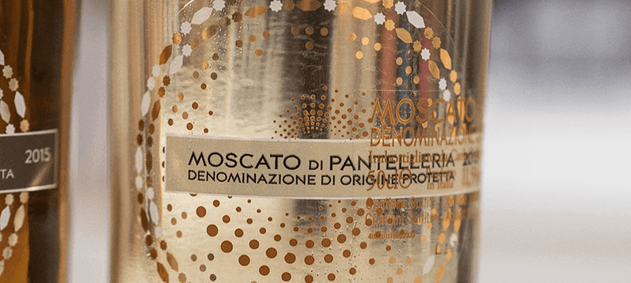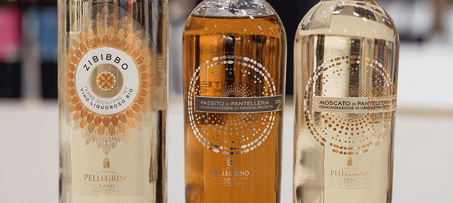 Carlo Pellegrino & C. Spa di Marsa, ha scelto l’agenzia Alias ADV, per vestire tre linee di vini dolci. L’etichetta adesiva, con applicata lamina oro e bronzo, presenta dei piccoli rilievi sulla superfice percebili al tatto. Il coordinato è composto da due bottiglie: moscato e passito, a cui si aggiunge lo zibibbo. Passito e moscato presentano il medesimo motivo grafico di tipo geometrico, nel caso del passito il motivo è rappresentato da toni chiari che ben contrastano con il colore ambrato del passito. Nel caso del moscato invece abbiamo un’inversion di tonalità e quindi un’etichetta con toni più scuri che contrastano sul colore paglierino della bottiglia.