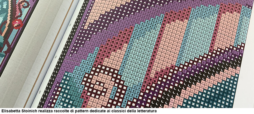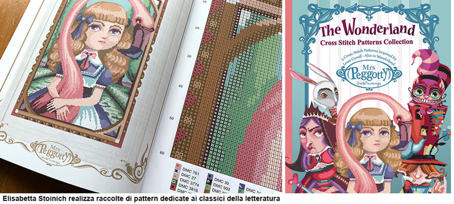 Proprio il rapporto tra canali digitali e prodotti fisici è ciò che ha convinto Elisabetta Stoinich –  illustratrice con una lunga esperienza nel settore editoriale con De Agostini, Zanichelli, Sperling and Kupfer, Mondadori e molti altri – a utilizzare il servizio di publishing di un notissimo e-commerce globale per raccogliere in volume i propri pattern dedicati ai classici della letteratura: «Lavoro come illustratrice dal 2005 e dal 2013 gestisco uno shop su Etsy dedicato ai miei progetti personali e autoproduzioni, i cui i prodotti principali al momento sono disponibili in digital download. Qualche anno fa ho lavorato con The Black Needle Society – subscription box dedicata alle appassionate di ricamo e punto croce – per una box a tema Sherlock Holmes. Conteneva un racconto di Conan Doyle e dei pattern a punto croce ispirati ai suoi personaggi, oltre al set di filati per realizzarli. Questa collaborazione mi ha dato l’idea di un libro che raccogliesse in bundle i miei pattern dedicati ai classici: il risultato è un volume di 80 pagine. La scelta del servizio è legata a diversi fattori: la possibilità di raggiungere un pubblico ampio, non solo le persone abituate a comprare da piccoli designer, e il fatto di potermi concentrare sul design e la comunicazione senza dovermi occupare di stampa, magazzino, inventario e logistica. Inoltre non ci sono costi di avvio della stampa o di creazione dell’inserzione, vengono detratti dalle vendite, per cui l’investimento principale è il tempo dedicato al design e alla comunicazione, che la rende una soglia di ingresso molto più accessibile. Va comunque tenuto presente che questo è uno strumento nato pensando ai libri di solo testo, che è stato poi adattato ai prodotti illustrati. Ad esempio c’è un’offerta sterminata di contenuti dedicati alle persone appassionate di bullet journaling e planning, o di coloring book per adulti e bambini. L’importante è avere chiaro che tipo di prodotto si propone: la grammatura massima delle pagine disponibili per ora è 90, per cui io ho scelto di non proporre le mie pagine da colorare tramite questo servizio perché una fetta di pubblico delle coloring pages la tratta come una vera e propria attività artistica, utilizzando acquerelli o pennarelli ad alcool: sono tecniche che hanno bisogno di carte con una certa struttura. Invece un volume di pattern da ricamo deve soprattutto guidare chi lavora nella costruzione dell’immagine, ma i fili da ricamo hanno dei codici – un po’ come una mazzetta Pantone – per cui la fedeltà del risultato è garantita dallo standard dei codici colore».