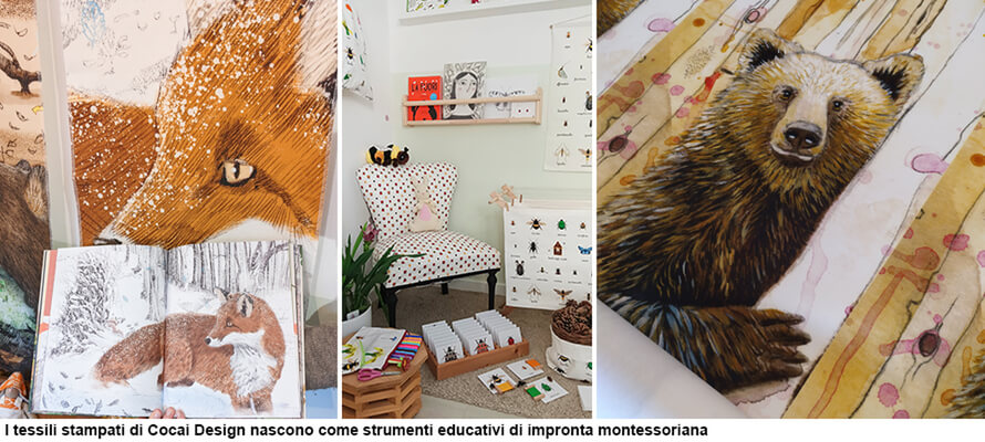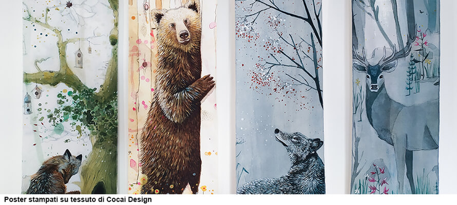 Uno dei segmenti che cresce maggiormente è la stampa on demand del tessile. Questa evoluzione ha aperto a sperimentazioni in ambiti in cui la barriera d’ingresso era alta, permettendo di esplorare modelli ibridi di proposta intorno a un’idea forte o a una voce autoriale riconoscibile. È il ruolo che ha avuto servizio di stampa on-demand su tessuto per Cocai Design, casa editrice il cui albo “Caduto. La seconda vita degli alberi” ha appena ricevuto la Menzione Speciale al concorso di Bologna Children Book Fair, tra oltre 3.500 libri in concorso. Ci racconta Valentina Gottardi, fondatrice del progetto con Maciej Michno: «Siamo nati 15 fa come studio creativo e web agency, e abbiamo lavorato spesso affiancando alla comunicazione visiva allestimenti museali e progettazione per la didattica, con una modalità di lavoro che combina contenuti interattivi online e offline, stampa e digitale. Con Cocai Design abbiamo iniziato lavorando sulle nomenclature montessoriane, un metodo di insegnamento basato sulla classificazione e il raggruppamento di oggetti in categorie che utilizza materiali concreti che i bambini possono manipolare. Ci siamo concentrati sul tema della natura, e abbiamo realizzato un cofanetto con un set di card cui abbiamo affiancato i poster stampati su tessuto. Il supporto di stoffa ha una morbidezza e una manipolabilità che lo rende più resistente alle interazioni coi bambini e più facile da portare in contesti come la scuola nel bosco: è agile da trasportare, allestire e disallestire, e può essere lavato facilmente dopo una giornata di utilizzo. Il fatto di arrivare da lavori sulla didattica museale ci ha portato a ragionare sui materiali che devono essere “a prova di bambino”, ma anche sull’impatto visivo degli allestimenti, da cui è venuta l’ispirazione per i nostri drappi illustrati, stampe di grande formato su canvas di cotone alte quasi due metri.