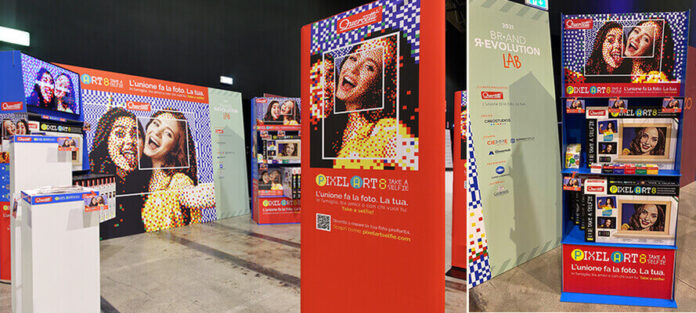 Gruppo Masserdotti ha realizzato tutti gli elementi per l’esposizione nei punti vendita. L’espositore per le scatole è realizzato con tecnologia di stampa digitale HP su laminato dello spessore da 4mm e adesivo polimerico. La struttura è concepita a incastro, in modo da replicare l’incastro dei chiodini del gioco di Pixel Art. Al suo interno è stato inserito un dispositivo da 32” per la proiezione di contenuti multimediali, fornito da dalla divisione Dominodisplay. Masserdotti ha realizzato anche rotair Forex da 5 mm con stampa UV bifacciale, sostenuti da un filo di bava per l’allestimento, fascioni antitaccheggio in tessuto di poliestere cucito, 100% green certificato Oekotex e stampati in sublimazione e i pendolini da sottoscaffale, stampati con tecnologia di stampa digitale HP su PVC 7/10 e dotati di molla.