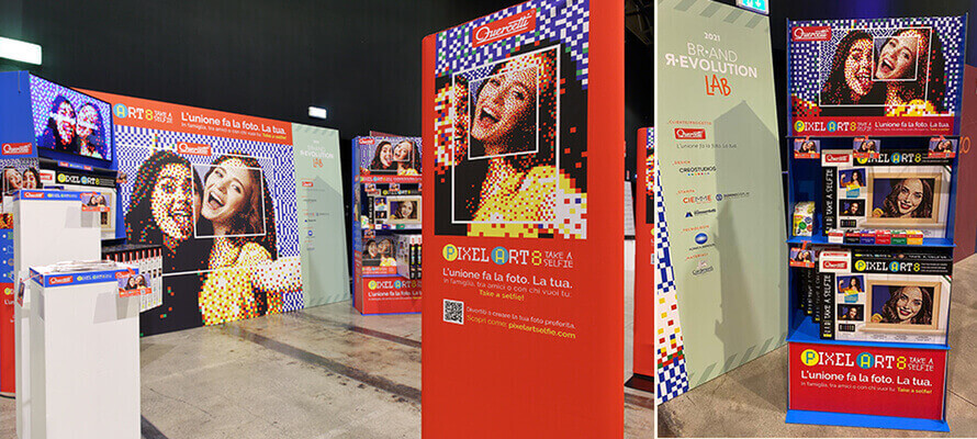 «Le potenzialità della stampa grande formato, molto efficace nella comunicazione diretta dove messaggio e stampa professionale fanno la differenza, unite alla possibilità di integrare elementi multimediali, ci hanno dato la giusta ispirazione per credere in questo progetto dove di grande c’è davvero tutto… anche le dimensioni della scatola che contiene Pixel Art 8 Take a Selfie», hanno detto Eladia Sillo e Giovanna Guglielmi, executive retail manager di Creostudios.