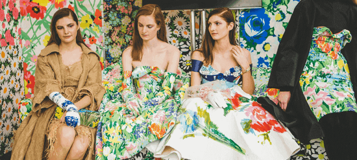 Motivi floreali appariscenti, vivacissimi nelle variegate fantasie cromatiche ed esuberanti negli accostamenti – spesso azzardati – con altri elementi grafici, come strisce e pois. Tessuti fuori dal comune – quali ciniglia pieghettata, velluto, lamina, pellicola in argento – decorati con stampe dalla testa ai piedi, letteralmente. L’istinto creativo di rivisitare disegni tradizionali nei modi più inattesi, conferendo un tocco di modernità e anticonformismo. Tutto questo è Richard Quinn, emergente stilista britannico che con le sue prime due collezioni – delle quali la primissima realizzata per la sfilata di diploma – ha attratto l’attenzione del mondo della moda, e non solo.