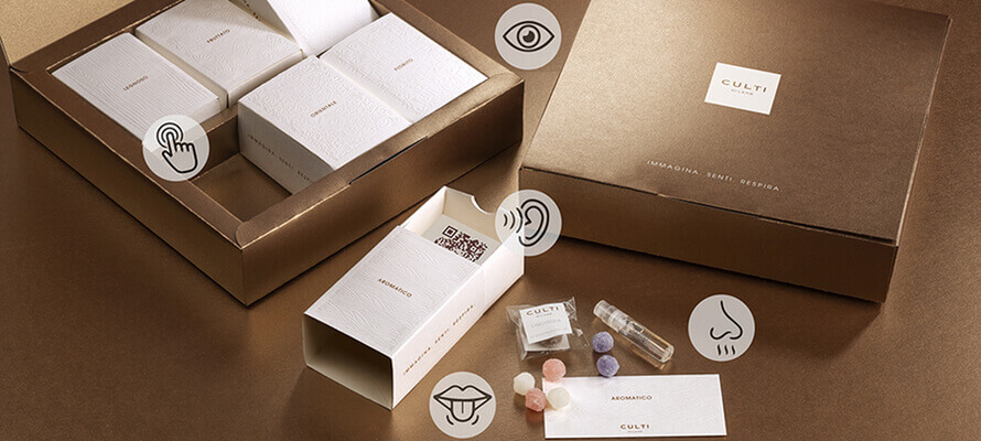 Sinestesia. I sensi si fondono e perdono i loro confini per creare una nuova realtà, un nuovo modo di percepire. Questo è partenza e arrivo di un’esperienza su cui focalizzare i pilastri portanti del brand: eleganza, elezione, unicità. Dal concept creativo alla realizzazione finale, l’obiettivo è sempre stato chiaro: regalare una nuova dimensione all’esperienza d’acquisto vissuta all’interno dei punti vendita CULTI MILANO e lasciare un ricordo unico e indelebile, da portare con sé nella memoria. Come altro riuscirci, se non andando a risvegliare tutti i cinque sensi, generatori stessi di ricordi indimenticabili? Da qui la creazione di un vera e propria esplosione di sinestesie che prende forma nella Senses Box CULTI, percorso sensoriale in grado di sviluppare nuove dimensioni percettive. L’esperienza sinestetica si concretizza nella scelta di carte di struttura successivamente lavorate in debossing, in grado di far emergere la loro espressività grazie alle texture studiate e personalizzate per ogni famiglia olfattiva e alla fragranza in esse impregnata.