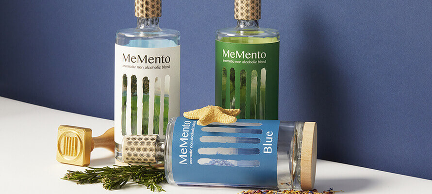 Il packaging MeMento conferma questo tipo di iconografia: «L’etichetta è double face e fustellata con cinque strisce verticali che rappresentano il logo MeMento e richiamano i cinque sensi e le cinque essenze che compongono la bevanda, ognuna distillata separatamente. Attraverso queste cinque fustellature si intravede sul retro dell’etichetta un paesaggio mediterraneo, caratterizzato da un diverso colore per ognuna della nostre miscele. Utilizziamo un’etichetta monomateriale in carta certificata FSC, bottiglia in vetro, tappo serigrafato e fondo in legno. Il grip tra tappo e bottiglia è in plastica, per il momento è ancora la soluzione migliore per assicurare l’integrità del prodotto, soprattutto per l’esportazione: le bottiglie devono affrontare viaggi di lunga durata verso mercati come gli Stati Uniti e l’Australia. Ancora più importante, non essendoci l’alcool in funzione conservante, per cui utilizziamo gli stessi standard di sicurezza delle bevande alimentari».