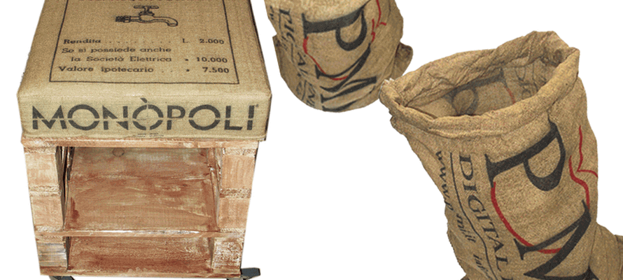 Per quanto riguarda i colori, si può stampare sia sulla juta grezza, color sacco, sia su quella sbiancata». Gli effetti che si ottengono sono ovviamente diversi: se sulla juta naturale è meglio non eccedere con le tinte anche per far risaltare la specificità del materiale, su quella bianca si può dare il via libera alla fantasia e utilizzare le normali tinte (meglio colori piatti, le sfumature non avranno certo una buona resa) disponibili. Tra gli oggetti d’arredo realizzati da Pomi i divertenti sgabelli “Monopoli”, la cui base è costituita da legno di bancale recuperato poi montato su rotelle, e le cui sedute riproducono (in monocromo o in quadricromia su juta bianca) le caselle del celebre gioco di società. Da segnalare anche i portaoggetti a sacchetto, realizzati sempre in juta, poi stampati in flatbed e infine immersi in una soluzione di colla vinilica. Estratti dalla colla, viene data loro la forma desiderata e mano a mano che la colla asciuga, i sacchetti si irrigidiscono, mantenendo però il loro tipico aspetto “morbido”.