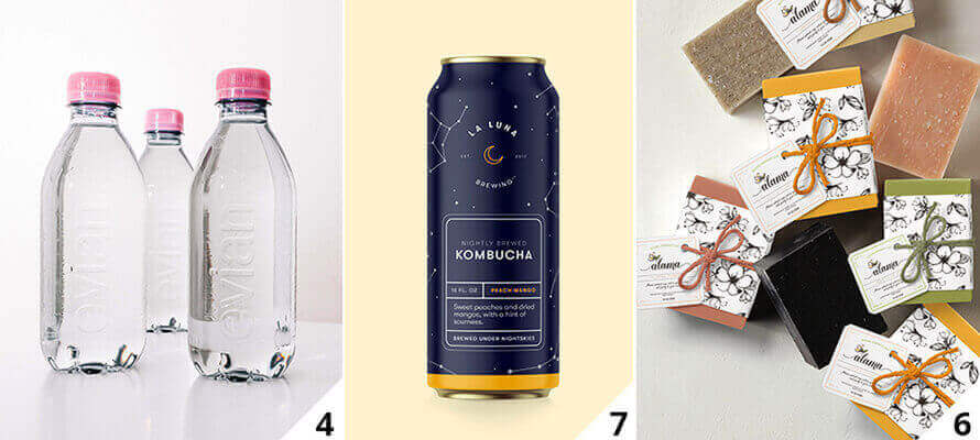 If the multi-faceted world of labelling is growing, the first reflection is also evident in the aesthetic choices, from materials to enhancements, from lettering to graphics. As the amount of information increases, the available space decreases, and creatives have to deal with a brand communication that must be attractive, clear, readable, and – most of all – essential. Main SqueezeJuice&Co(3) has left out the superfluous and created labels where all the information stands out clearly in white against the natural colour of its juices. Evian(4) has gone one step further by removing the label altogether and embossing the brand directly onto 400cl bottles. And because sustainability goes with wholesomeness, the brand’s return to its origins is an increasingly topical choice with the first logo, the first slogan and the founding values. In this way, the consumer is made to feel at home, pampered and emotionally attached. This is the choice made by Barilla(5). For its 145th anniversary, it has redesigned its logo, which has become a more intense solid red, and has ended the period of light blue packages to return to the traditional blue. In addition, all packages will have a transparent window, saving 126 thousand tonnes of plastic per year. Latteria Soresina, one of the most important companies in the Italian dairy sector and the world’s leading producer of Grana Padano cheese, is also returning to its roots. Nature and the environment certainly do not get along well with artificial colours. So white is the preferred background colour on which soft shades and pastel tints are used, as in Sephora brand products, which has set itself the objective of 100% recyclable or reusable packaging by 2025, or Alama(6), which produces natural handmade soaps. Even when foils or metallic colours are used on cans, they are de-powered. The La Luna Brewed brewery(7) has chosen to do this by using an opaque blue with negative lettering for its Kombucha, which brings out the aluminium of the can. This applies to wine labels and cosmetics, the leading trendsetters in the sector. When the background is white, one choice that is becoming more popular is to use gradients, i.e. colours that fade from solid to give depth and freshness; another choice is for a retro-futuristic look, as in the case of Raw Earth shampoo or the Bio Salts(8) bath salts created by graphic designer Anton Proskuryakov, or the Kukus Gin bottle created by 99design, a creative collective from Oakland, California. The colours, when not pastel, remain solid without shading. Sometimes they are not printed but dyed in the paste, so the label becomes the packaging, as for the vegan cosmetics brand Thrive Causemetics.