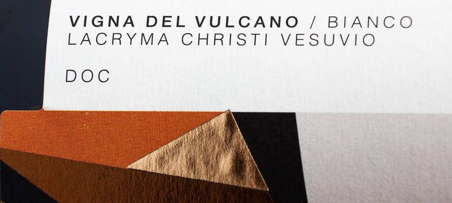I tratti dei disegni offrono un Vesuvio inedito, con una complessa geometria poligonale delle rocce che richiama sia le peculiarità del territorio ma altresì i legami che hanno le comunità locali: come è nell’essenza di Villa Dora, azienda ancorata alle radici ma costantemente alla ricerca di tecniche innovative nei processi di vinificazione per raggiungere forme di eccellenza. I triangoli appuntiti sono al centro dei disegni, i colori intensi regalano una sorprendente presenza scenica, le tonalità che circondano l’icona del vulcano dominante sono ricche di espressività: l’effetto della materia è ottenuto con tecniche di stampa che si avvalgono di inserti in foglia oro o argento a caldo, per richiamare le superfici ruvide delle pietre.