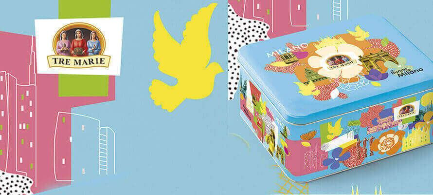 Da sei anni, futurebrand cura la comunicazione del marchio Tre Marie per quanto riguarda le business unit dedicate alle ricorrenze (panettoni, colombe) e ai prodotti dolciari “everyday” (wafer, biscotti, torte). Per un brand fortemente connesso alla tradizione lombarda, si è scelto di incentrare il posizionamento sul legame con la città natale, come riassunto magistralmente dal payoff “Il buono di Milano”. Graficamente, questo si è manifestato attraverso la scelta di illustrare architetture e monumenti simbolo della città. «Sui pack più rappresentativi del marchio abbiamo proposto una versione stilizzata di alcuni luoghi-simbolo: il Duomo e la Galleria in primis, ma anche posti meno noti a chi non vive a Milano come l’iconica rotonda della Besana» spiega Christian Trabucco, Senior Account Executive di futurebrand. La scelta della latta deriva dalla volontà di utilizzare materiali duraturi, proponendoli in una versione più contemporanea e rendendoli personalizzabili in ogni dettaglio. Dopo il primo successo della campagna 2019, si è deciso di dare continuità a questa scelta donando ulteriore valore aggiunto al prodotto. «Per Pasqua abbiamo creato una limited edition che presentasse tutte le varianti della colomba Tre Marie», prosegue Trabucco. «Il pack ispirato alla Pop Art racconta i valori cardine del brand e, al tempo stesso, rende omaggio alla cultura pop e alla città di Milano». Lo stile illustrativo stilizzato di monumenti, tendenze e altri elementi “tipici” della città (come gli iconici tram) si unisce ai fiori che richiamano l’elemento primaverile. La stessa agenzia si è occupata anche di “Dedicato a Te”, nuovo progetto di Mulino Bianco.