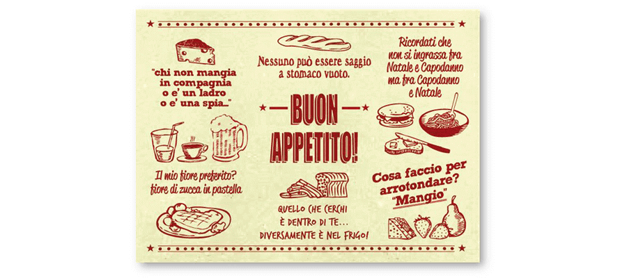 Come rendere “nuovo” un concept più che tradizionale come una pizzeria o un ristorante specializzato in primi piatti? Permettendo al cliente non solo di conoscere le ricette (in particolare se si usano impasti originali e non-convenzionali per la pizza) ma anche di portare la ricetta… a casa. Le tovagliette possono diventare delle schede da collezionare, magari dotandole di appositi fori per raccoglitore ad anelli.