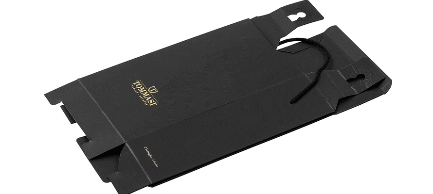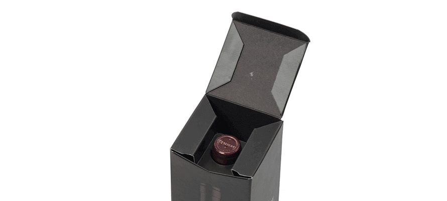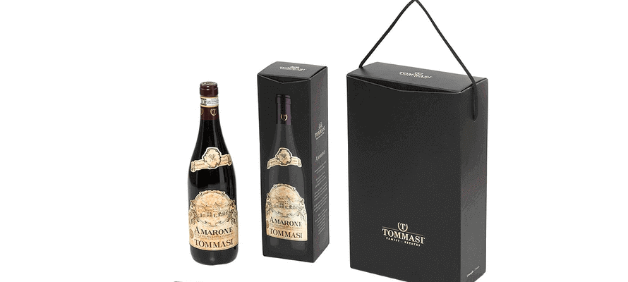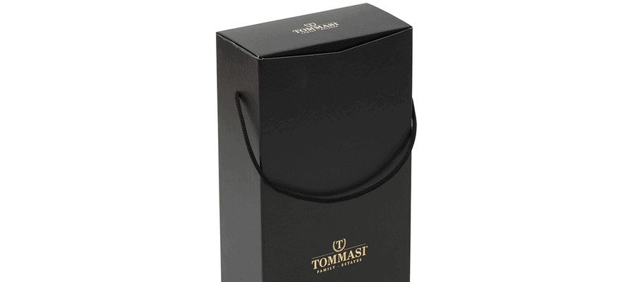 Caratteristiche fondamentali per le scelte estetiche di Tommasi che per il packaging studiato per il canale duty free, in formato 0.75l, prevede una una plancia interna su carta nera tinta in pasta e una plancia esterna stampata, su cui, grazie al contrasto tra vernice serigrafica lucida a registro e fondo nero plastificato opaco antigraffio è riprodotta la bottiglia e i suoi dettagliatissimi particolari quali l’etichetta e il tappo. La particolare struttura e il sistema di bloccaggio incorporato nell’astuccio garantiscono la robustezza e tenuta delle bottiglie in fase di trasporto.