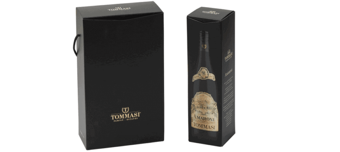 Caratteristiche fondamentali per le scelte estetiche di Tommasi che per il packaging studiato per il canale duty free, in formato 0.75l, prevede una una plancia interna su carta nera tinta in pasta e una plancia esterna stampata, su cui, grazie al contrasto tra vernice serigrafica lucida a registro e fondo nero plastificato opaco antigraffio è riprodotta la bottiglia e i suoi dettagliatissimi particolari quali l’etichetta e il tappo. La particolare struttura e il sistema di bloccaggio incorporato nell’astuccio garantiscono la robustezza e tenuta delle bottiglie in fase di trasporto.
