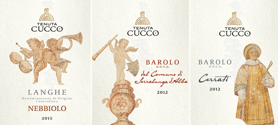 Le etichette delle nostre bottiglie sono il primo manifesto della nostra nuova identità. E raccontano ancora una volta, non solo nel marchio, il territorio da cui questo vino proviene. Sono stati scelti infatti alcuni frammenti degli affreschi che nel corso dei secoli, anche con sovrapposizioni successive, hanno decorato la chiesetta di San Sebastiano nel Borgo, che fa parte di Tenuta Cucco, e che è stata la chiesa del paese sino al 1888. Santi, putti musicanti, notabili della Savoia: ciascun personaggio emerge con la sua sontuosità, come nel caso delle etichette dei cru Cerrati o della Riserva, oppure con la sua gioiosa freschezza, come per i putti sorridenti che caratterizzano il resto della linea. Siamo felici di questa scelta, che RobilantAssociati ha poi reso con alcune soluzioni che inseriscono queste immagini della storia di Serralunga, la sua storia popolare, nella contemporaneità grazie a un’identità che interpreta la vocazione all’innovazione e alla qualità totale della cantina e il suo radicamento nel territorio, nel segno dell’eccellenza e della valorizzazione dell’italianità. Abbiamo contemporaneamente costruito un nuovo sito, nel quale ci siamo soffermati a lungo anche sulla storia del castello che campeggia nel nostro logo.