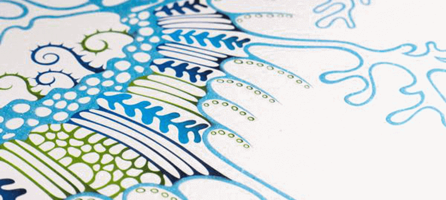 Per i soggetti si è scelta una grafica vettoriale, essenziale, molto pulita, realizzata con ripetizioni di linee e di curvature, piccoli tratteggi, qualche pattern, abilmente enfatizzati dalle numerose lavorazioni di nobilitazione, in linea e fuori macchina. È così che sfogliando i mesi ci si imbatte in conchiglie madreperlate realizzate in cold foil, piuttosto che tridimesionali in bassorilievo, o ancora in laser, ma anche in stelle marine rugose e ruvide, come pure in lucenti delfini argentati, trattati in serigrafia piuttosto che in lamina, per giungere ai microdentelli dermici della pelle dello squalo ottenuti in vernice. Le differenti lamine, incluse alcune stupendamente microincise con cliché a effetto artistico fornite da Luxoro e H+M, creano stimolanti giochi di luce che si stagliano nelle differenti carte scelte nelle gamme di Polyedra, con le patinate Ribelle e Gardamatt, e nelle naturali speciali Keaykolour, Curious e Rives di Arjowiggins.