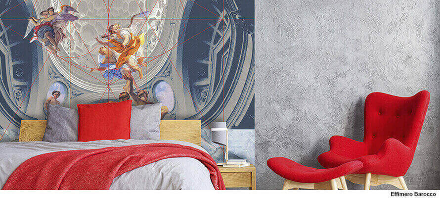 Un altro trend riguarda l’abbandono del modernismo minimal, spesso omologato e senza carattere, in favore di una mescolanza di stili. Un’esigenza che va a braccetto con una generale richiesta di maggior personalizzazione, che i progressi nell’ambito della grafica e delle tecnologie digitali hanno reso possibile. Da queste suggestioni nasce l’idea di Effimero Barocco, una collezione di grafiche digitali ideata per l’interior décor e la riproduzione su supporti come carte da parati, rivestimenti, tessuti e tappezzerie. Il progetto è opera degli architetti Cecilia Anselmi, Carlo Pianosi e Fabio Gasparri, appassionati di arte, fotografia e grafica. «Carlo lavora molto nella progettazione d’interni, Fabio è anche fotografo ed ha un brand di fashion design – spiega Anselmi – e per quanto riguarda me, dal 2015 porto avanti una ricerca grafica con l’elaborazione di immagini digitali, la serie di collage della Linea Rossa, che nel 2018 ha esordito con una mostra a Roma dal titolo Concetto Lineare e che ha trovato in questa nuova collezione di disegni una sua naturale prosecuzione». Il progetto di wallcovering Effimero Barocco omaggia l’iconografia dell’epoca barocca e di Roma, ma è anche una rielaborazione in chiave contemporanea di frammenti di immagini di quel periodo collezionate dai tre progettisti. La stampa digitale ha permesso di riprodurre le immagini in diversi formati e su diversi materiali: dai TNT PVC free alle viniliche, stampate con inchiostri ecocompatibili. Partner tecnico del progetto è Decorum Wallcoverings & JdS StudioDesign, grazie al quale le grafiche possono essere riprodotte in diverse scale dimensionali su qualsiasi tipologia di carta da parati. «Effimero Barocco è un progetto pensato per adattarsi alla stampa su altri supporti, mantenendo un certo margine di personalizzazione», aggiunge Anselmi. «A ispirarci sono state la visionarietà delle collezioni di Piero Fornasetti, le trame geometriche di Giò Ponti, gli accostamenti surreali di Carlo Mollino, le forme astratte della scultura e dell’architettura barocca, di cui scriveva Luigi Moretti». Effimero Barocco è stata presentata a fine ottobre 2020 in occasione della Rome Art Week nella sede di Studio Room 28b a un pubblico di addetti ai lavori con un allestimento dedicato alle stampe di alcuni prototipi di carte da parati. Dopo una fase di messa a punto e testing della parte grafica e della resa qualitativa su diversi supporti, ora il team sta lavorando a una piattaforma di e-commerce. Una proposta che non rifiuta il nuovo, ma piuttosto cerca di contaminarlo, ribadendo che l’arte, in ogni sua epoca, è una fonte inesauribile di ispirazione sia per reinventare in maniera vitalistica il presente che per immaginare il futuro. Fosse anche a partire dalle pareti.