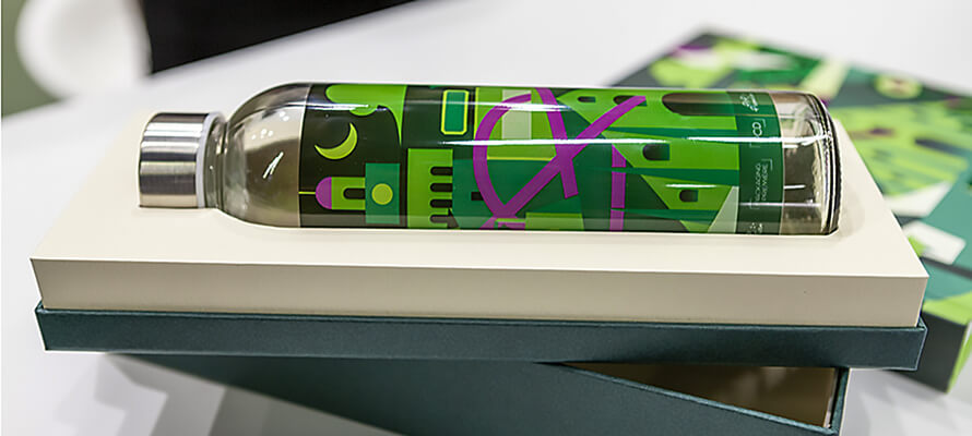 La borraccia in vetro è firmata P&P Promotion, azienda specializzata nella serigrafia e decorazione del vetro. Per l’occasione, P&P ha completato l’acquisto di una macchina digitale. Un traguardo importante che ha permesso di lavorare con una buona resistenza su 360° senza stacchi, con colori superlucidi differenti dalla gamma UV.