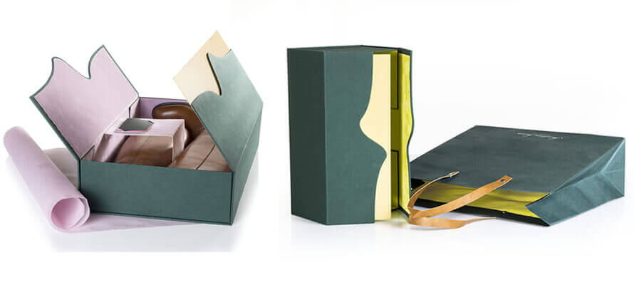 In due diverse dimensioni, le shopper hanno un’anima di cartone da 350 g/mq e sono rivestite esternamente con WIBALIN® NATURAL 553 Dark Green, carta tinta in pasta 100% pura cellulosa ECF divenuta un vero e proprio brand di riferimento nel settore delle arti grafiche, grazie all’ottima lavorabilità e la vasta gamma di colori e goffrature. Gli interni sono rivestiti in tre varianti: WIBALIN® NATURAL 518 Sunshine e WIBALIN RECYCLED NATURAL nei due colori 904 Pecan e 906 Dusk, carta tinta in pasta 100% in fibre riciclate (60% PIW e 40% PCW) dai colori inspirati alla natura. Un mix eccellente di affidabilità, qualità e sostenibilità. Le shopper, realizzate da Retail Pak, hanno le maniglie realizzate con gli sfridi di lavorazione del pellame delle calzature. Anche le shopper, come le scatole, abbinano al verde della carta la stampa a caldo color champagne del LUXOR® MTS 102022.