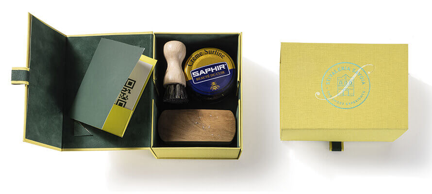 Il kit per la cura delle calzature Stivaleria Savoia, contenente lucido e spazzole, è realizzato da Retail Pak con anima di cartone da 2,5 mm rivestita esternamente di BRILLIANTA® Lenzing™ Ecovero 100% FSC nel colore 4251 Giallo e internamente del floccato SENSE PLAIN nel colore 5790 Zucchini. La stampa a caldo del bollo è realizzata con LUMAFIN® MS 799 Clear per la S, mentre la parte in verde è realizzata con LUXOR® MTH 107459 Bizarre Green.