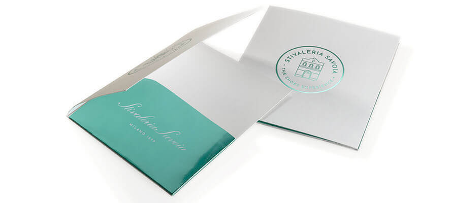 L’elemento di maggiore ispirazione per lo sviluppo del lavoro è stata la scelta dei materiali di Fontana Grafica e Luxoro. Pensare di poter rivestire ogni elemento con un materiale ad hoc è stato il driver principale, accompagnato dalla scelta di utilizzare la stampa a caldo su tutti gli elementi. La parte cartotecnica è stata realizzata da Retail Pak, che ha accoppiato i materiali di Fontana Grafica a cartone rigido dello spessore di 2,5 mm e ha assemblato a mano tutte le parti. Per gli esterni delle scatole in due diverse dimensioni, abbattibili per risparmiare spazio, una per le scarpe e l’altra per gli stivali, è stata scelta la tela BRILLIANTA® Lenzing™ Ecovero 100% FSC nel colore 4047 Verde. La “regina” della collezione di tele per legatoria di Fontana Grafica ha una struttura tessile a trama fitta ed è prodotta con filato Lenzing™ Ecovero 100% FSC®. Combina eleganza e una buona lavorabilità, anche in cartotecnica, e pertanto si è dimostrato il materiale giusto per rappresentare Stivaleria Savoia. Gli interni delle scatole sono stati rivestiti con SENSE PLAIN nei colori 5358 Walnut, 5394 Banana e 5821 Tourmaline. Si tratta di un floccato su carta certificato FSC® e interamente riciclabile grazie all’utilizzo di flock 100% a base di cellulosa, principalmente eucalipto FSC®. Il tocco morbido che ricorda il velluto è l’ideale per proteggere le preziose calzature. La stampa a caldo del nuovo bollo Stivaleria Savoia è realizzato con un unico elegante colore, il LUXOR® MTS 102022, uno champagne che ben si abbina al verde della tela e incarna un perfetto equilibrio di classicità.