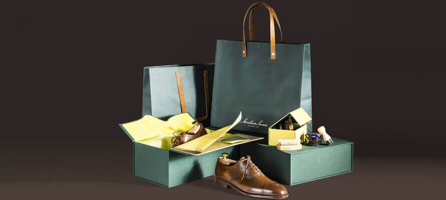 In due diverse dimensioni, le shopper hanno un’anima di cartone da 350 g/mq e sono rivestite esternamente con WIBALIN® NATURAL 553 Dark Green, carta tinta in pasta 100% pura cellulosa ECF divenuta un vero e proprio brand di riferimento nel settore delle arti grafiche, grazie all’ottima lavorabilità e la vasta gamma di colori e goffrature. Gli interni sono rivestiti in tre varianti: WIBALIN® NATURAL 518 Sunshine e WIBALIN RECYCLED NATURAL nei due colori 904 Pecan e 906 Dusk, carta tinta in pasta 100% in fibre riciclate (60% PIW e 40% PCW) dai colori inspirati alla natura. Un mix eccellente di affidabilità, qualità e sostenibilità. Le shopper, realizzate da Retail Pak, hanno le maniglie realizzate con gli sfridi di lavorazione del pellame delle calzature. Anche le shopper, come le scatole, abbinano al verde della carta la stampa a caldo color champagne del LUXOR® MTS 102022.