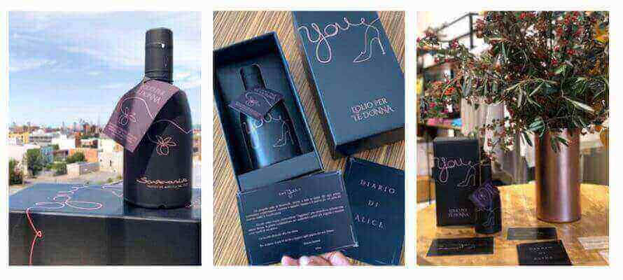 Il design presenta un abbozzo di una scarpa con tacco rosa disegnato dalla penna di Alice, in memoria della forza tutta femminile della zia Mina che portava solo scarpe con il tacco e a cui il progetto è dedicato. Il tratto continua sul retro fino a raggiungere un altro simbolo dell’azienda committente. Le olive sono il frutto dal quale l’olio viene estratto e provengono interamente da terreni appartenenti a donne e sempre da loro stesse coltivati.